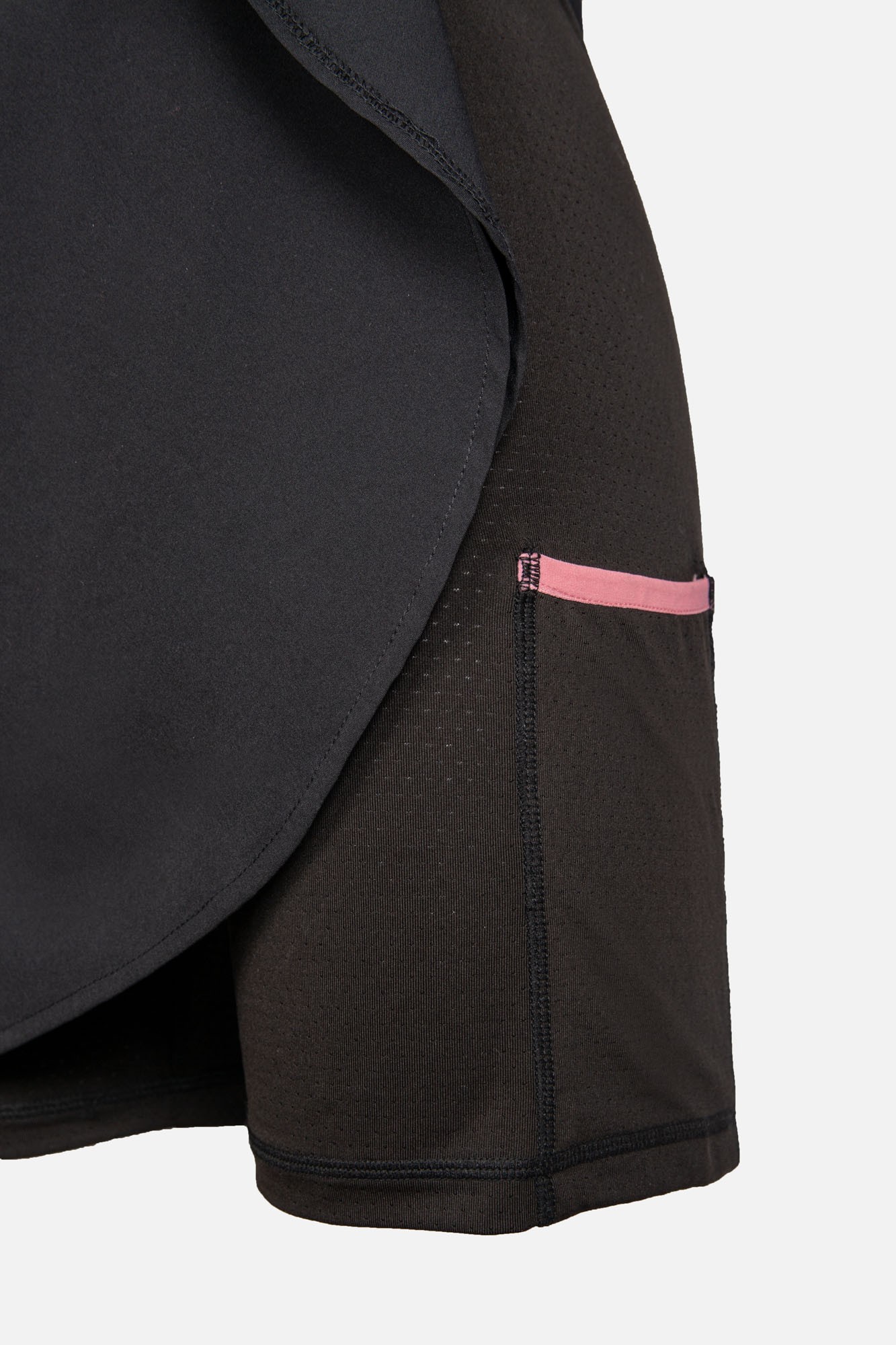 La gonna short RUNNA è dotata di due tasche: una presente sugli shorts e una sul retro, chiudibile con zip, che ti daranno la possibilità di portare con te piccoli oggetti essenziali, come le chiavi o il telefono, senza dover rinunciare alla comodità.